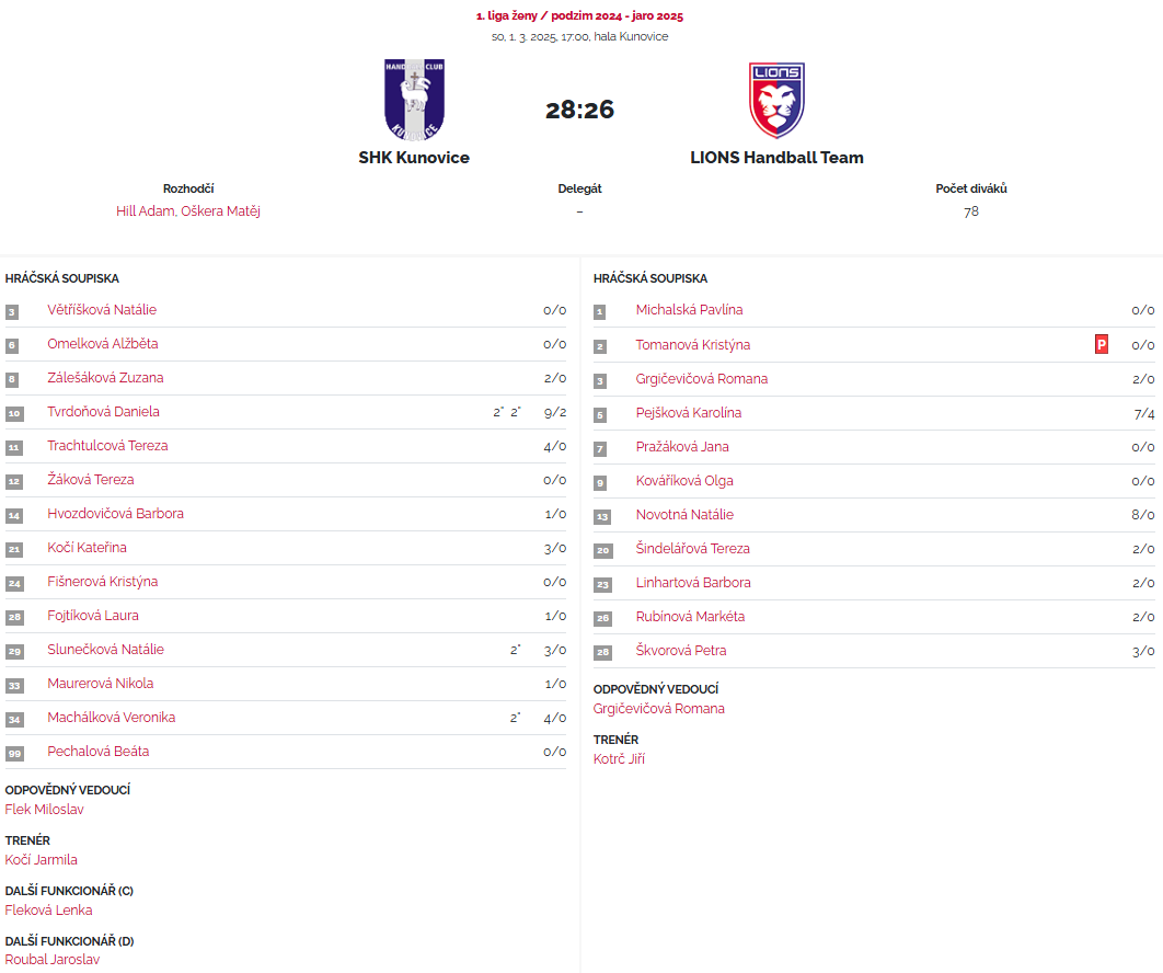 Ženy na úspěch mladších dorostenek o hodinu později navázaly utkáním s týmem LIONS HANDBALL TEAM Hostivice. Naše holky začaly v rychlém tempu a v osmé minutě již vedly 6:1. Po poločasovém vedení 17:13 se soupeři podařilo poprvé srovnat skóre ve 13. minutě na 21:21. Od tohoto okamžiku se náš tým dostával do vedení maximálně o dvě branky, ale výborným výkonem si výsledek již ohlídal a zvítězil 28:26. Holkám patří poděkování za skvělý sportovní zážitek.