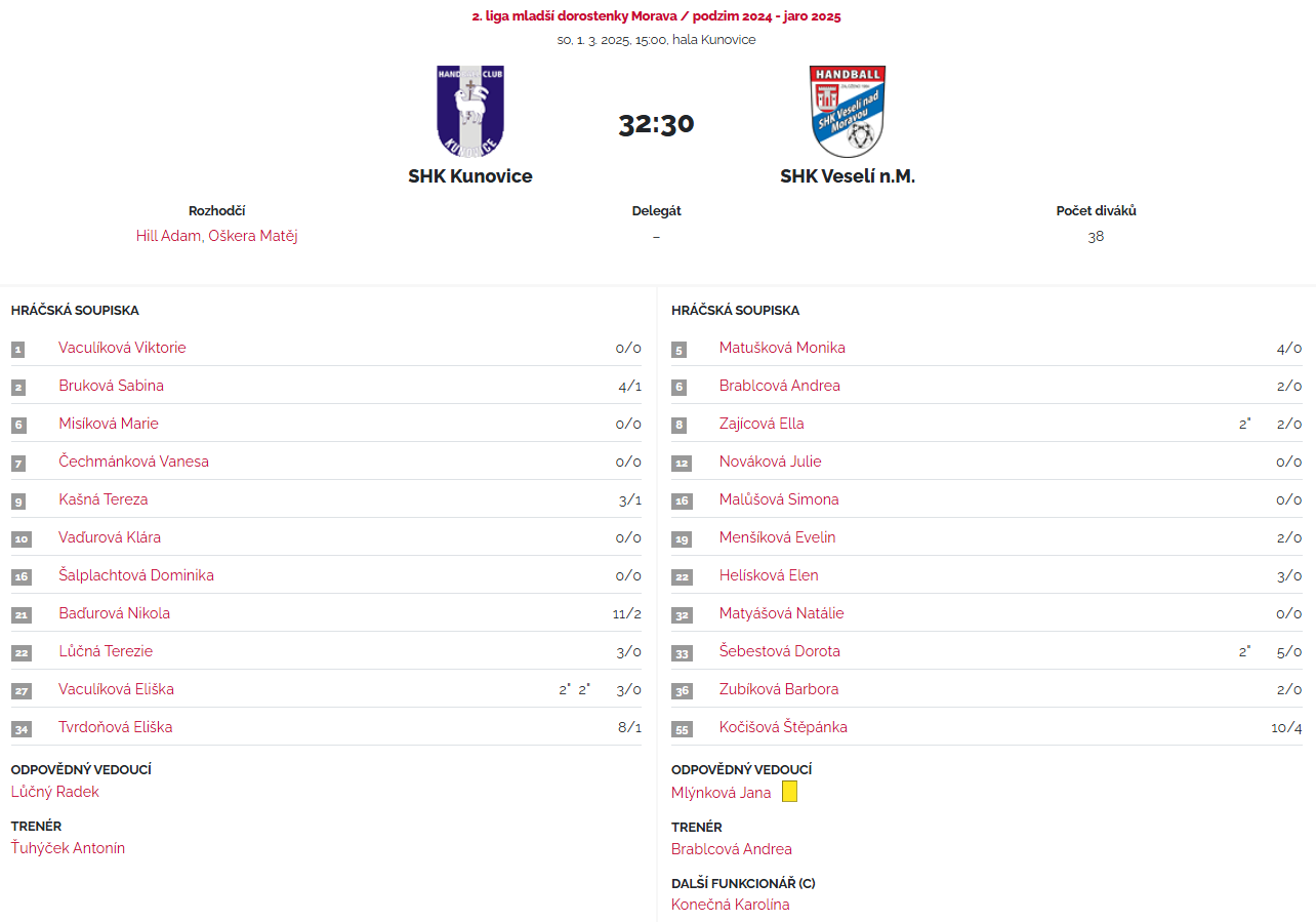 Mladší dorostenky v sobotu 1.3. přivítaly v rámci 15. kola na domácí palubovce hráčky sousedního SHK Veselí nad Moravou. Jednalo se o velmi vyrovnané utkání, které po poločase 15:15 směřovalo k dramatické koncovce. Až ve 23. minutě druhé půle se podařilo našim holkám dostat do rozhodujícího čtyřbrankového vedení, na které již soupeř nedokázal zareagovat, a zvítězili jsme tak 32:30. Díky třetímu vítězství v jarní části jsme udrželi třetí místo v tabulce, jen bod za druhým týmem.